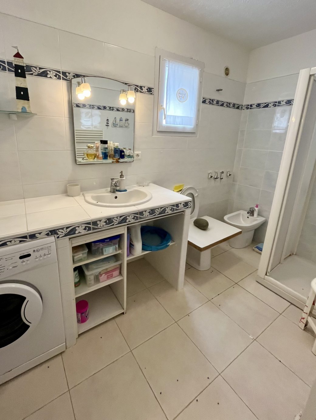 Une   salle  d’eau avec Wc , sèche serviette .